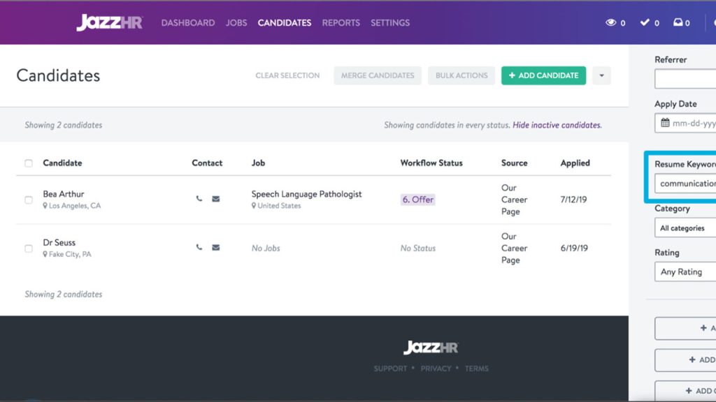 همان‌طور که گفتیم JazzHR آمده تا بازار ATS سازمان‌های کوچک را تصاحب کند. برای این منظور قیمت‌های منصفانه ماهانه در کنار امکان انتخاب ویژگی‌هایی که مورد نیاز شما و سازمان است را قرار داده، تا سازمان‌های کوچک (SMBs) بتوانند به بهترین شکل از امکانات آن بهره‌مند شوند. مشکلی که می‌توان در رابطه با JazzHR آن را کمی توی ذوق‌زننده دانست، نداشتن اپلیکیشن موبایل است که برای کارهای کمی پیچیده شما را مجبور به استفاده از نسخه‌ی دسکتاپ می‌کند.