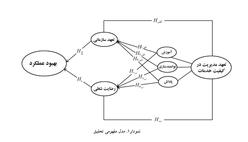 در مدل مفهمومی بالا براساس تحقیقات تعهد مديريت در نحوه ارائه خدمات به کارکنان (که شامل: آموزش کارکنان، توانمندسازي و نحوه اعطاي پاداشها ميباشد)، با رضايت شغلي و تعهد کارکنان رابطه مستقيم دارد و در نهايت بهبود عملکرد در خدمات رساني به مشتريان متأثر از تعهد سازماني و رضايت شغلي کارکنان رده عملياتي است.